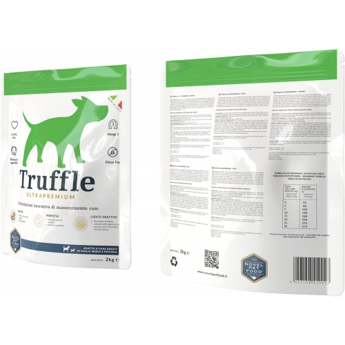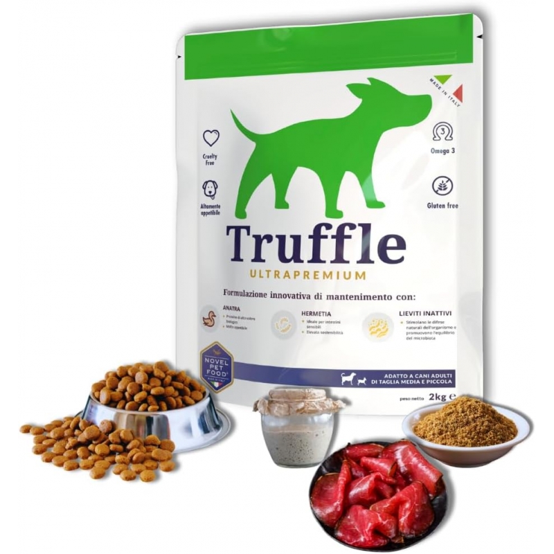 Truffle ultrapremium Anatra è una ricetta che non contiene fonti di glutine. Si compone di due materie prime principali, l’anatra e la farina delle larve di Hermetia illucens (la mosca soldato): la prima apporta proteine di elevato valore biologico ed è molto appetibile, la seconda, oltre all’elevato valore nutrizionale, si ottiene in modo sostenibile ed è indicata per animali con intestino sensibile. ALIMENTO COMPLETO ADATTO A CANI ADULTI DI TAGLIA MEDIA E PICCOLA