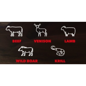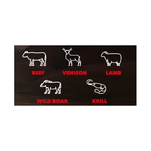 Composizione: manzo fresco (26%), manzo disidratato (23%), grasso di manzo (9%), piselli, ceci, patate dolci, brodo di salmone (3%), mele, carne di cervo disidratata (1%), agnello disidratato ( 1%), cinghiale disidratato (1%), krill antartico disidratato (1%, fonte naturale di EPA e DHA), semi di lino, sostanze minerali, olio di salmone (0,5%), lievito di birra, cicoria (fonte naturale di FOS e inulina), idrolizzato di lievito (una fonte naturale di MOS e beta glucani), asparagi, cuori di topinambur, kiwi verdi, spinaci, membrana di guscio d'uovo (200 mg/kg), mirtilli rossi (200 mg/kg), mirtilli (200 mg /kg), funghi reishi (200 mg/kg), funghi coda di tacchino (200 mg/kg), funghi chaga (200 mg/kg), peptidi di collagene (200 mg/kg), Ascophyllum nodosum, ananas (fonte di bromelina) (200 mg/kg), radice di curcuma (200 mg/kg), glucosamina cloridrato, condroitin solfato, spirulina.