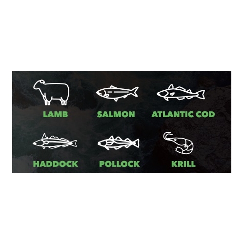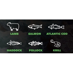 Composizione: Agnello fresco (26%), aringa disidratata (16%), coregone disidratato (16%, di cui merluzzo atlantico, eglefino e merluzzo bianco), grasso di manzo (9%), piselli, ceci, patate dolci, mele, fegato idrolizzato (2%), krill antartico disidratato (1%, fonte naturale di EPA e DHA), minerali, lievito di birra, cicoria (fonte naturale di FOS e inulina), olio di salmone (0,5%), asparagi, Gerusalemme cuori di carciofo, kiwi verdi, spinaci, membrana di guscio d'uovo (200 mg/kg), mirtilli rossi (200 mg/kg), mirtilli (200 mg/kg), funghi reishi (200 mg/kg), funghi coda di tacchino (200 mg/kg ), funghi chaga (200 mg/kg), peptidi di collagene (200 mg/kg), Ascophyllum nodosum, ananas (fonte di bromelina) (200 mg/kg), radice di curcuma (200 mg/kg), glucosamina cloridrato, spirulina.