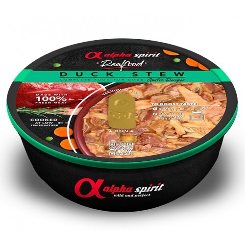 Composizione: 97% anatra fresca in salsa, piselli, carote, patate dolci, prezzemolo, curcuma, pomodoro.