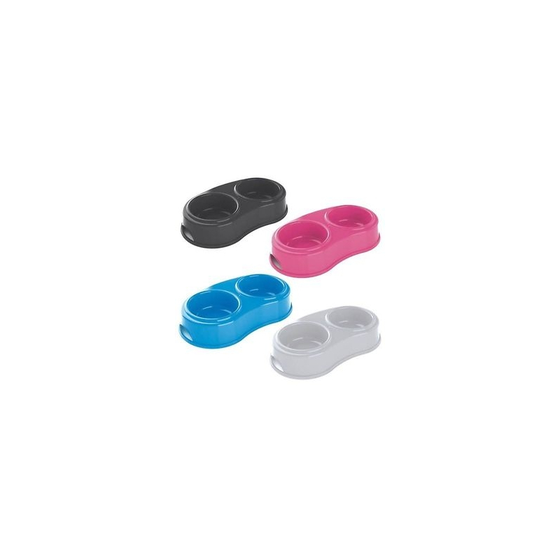 Ciotola doppia in plastica semplice ma robusta, ideale sia per gatti che per cani. Questa ciotola doppia è adatta sia per il cibo che per l'acqua, è leggerissima ma resistente, è dotata di gommini antiscivolo ed è comoda da maneggiare grazie alle maniglie laterali.