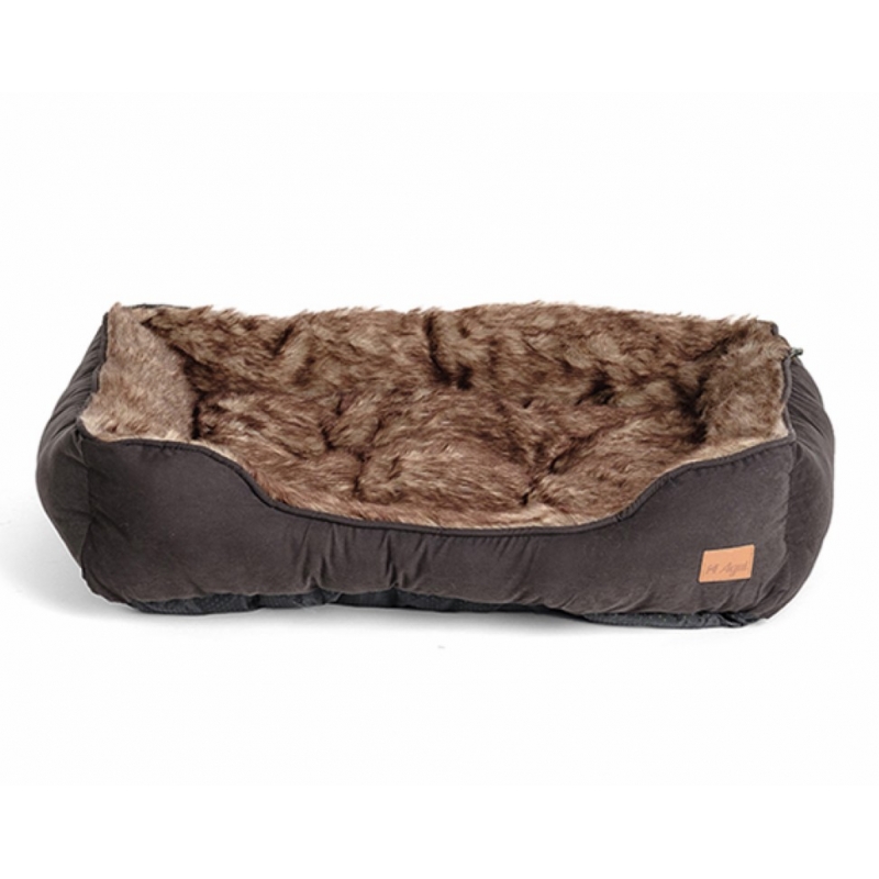 Cuccia realizzata con tessuto morbido e logo in pelle. Interno realizzato in morbida e lunga pelliccia. Imbottitura interna in fibra riciclata al 100%.