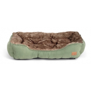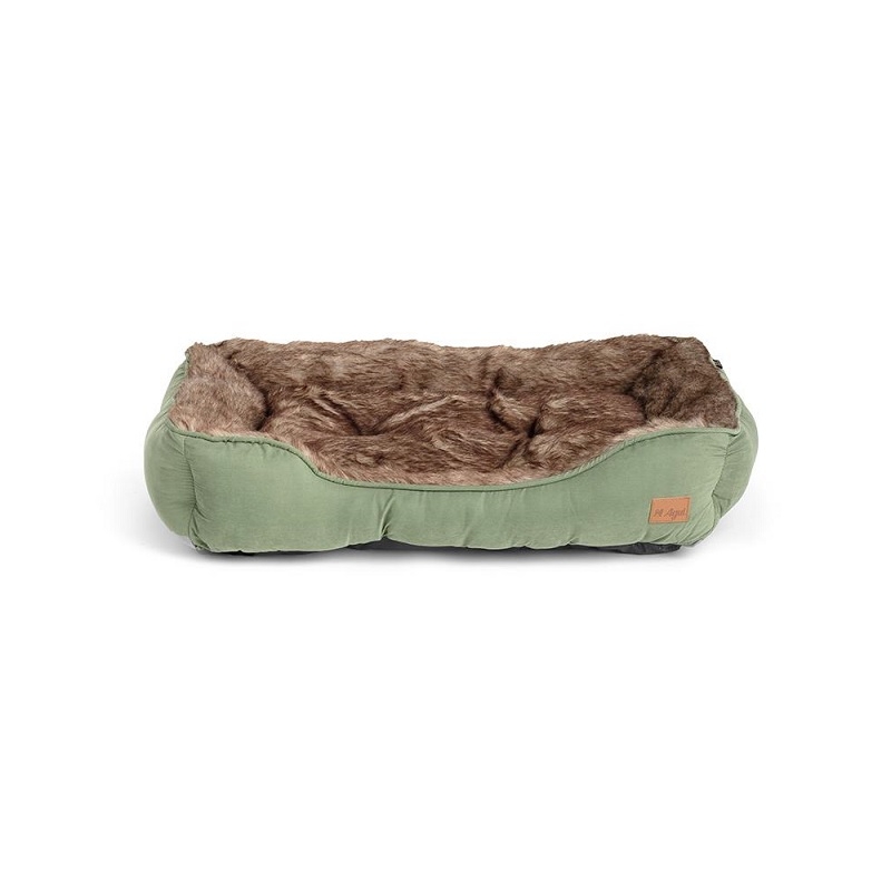 Cuccia realizzata con tessuto morbido e logo in pelle. Interno realizzato in morbida e lunga pelliccia. Imbottitura interna in fibra riciclata al 100%