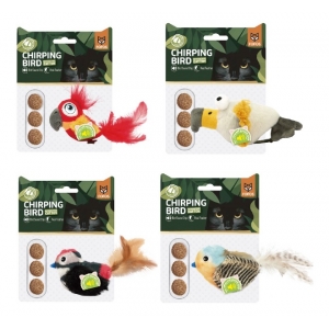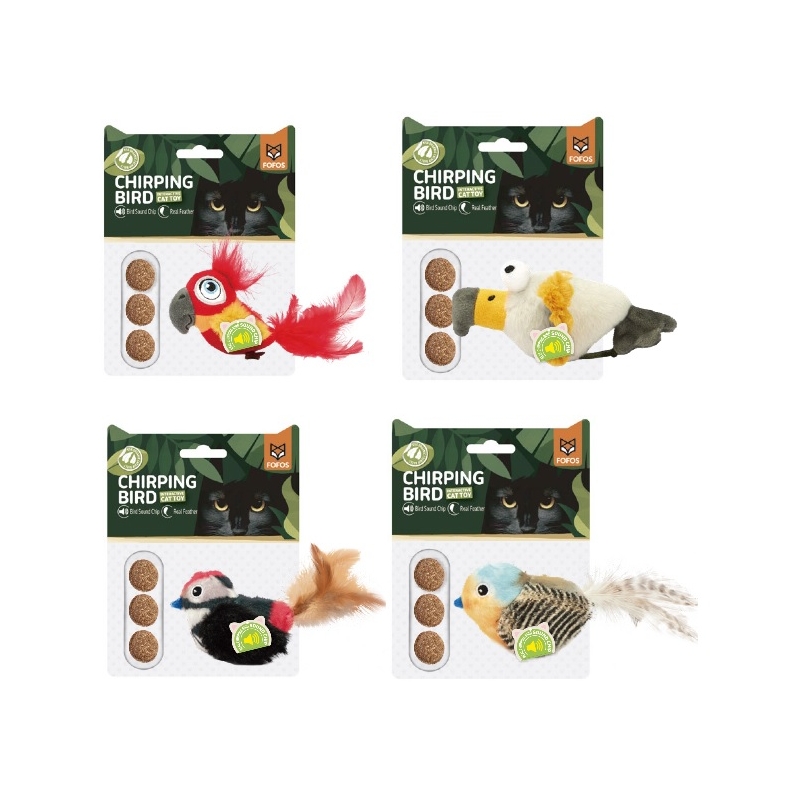 Giocattolo interattivo per gatti con pallina di erba gatta biologica e chip cinguettante all’interno.